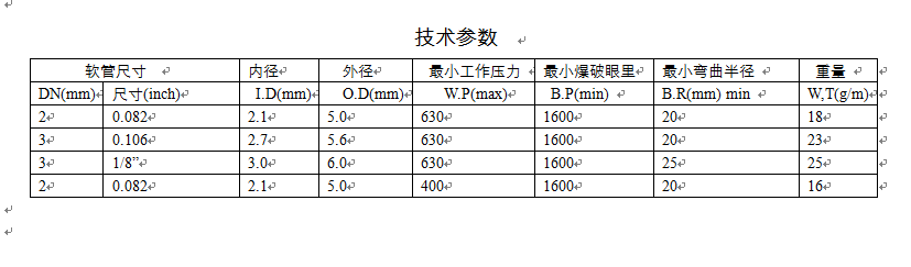 a.      材质 material :芯管材料 尼龙PA11(Nylon PA11)  增强编织层 芳纶纤维( Aramid fibre)